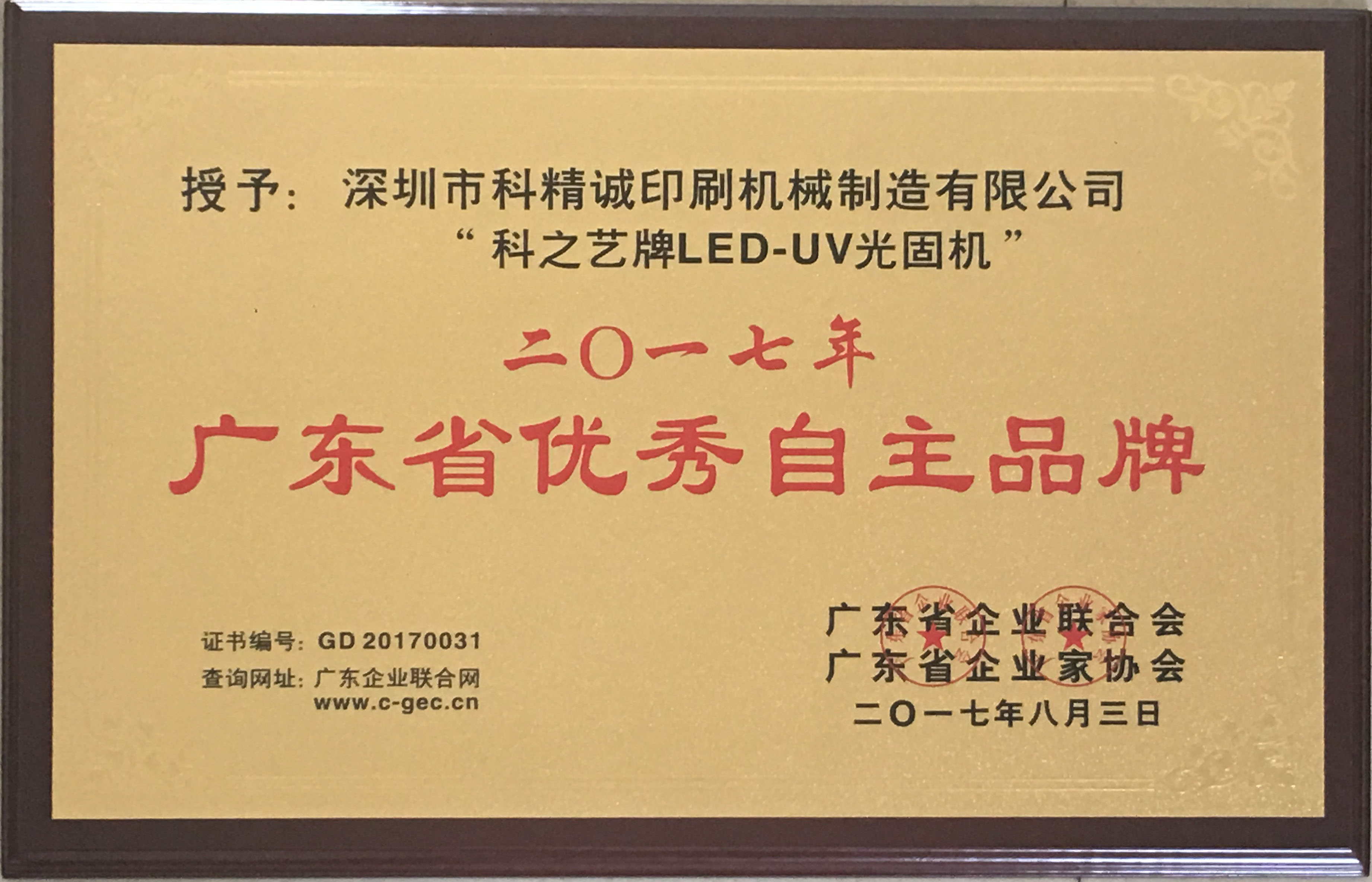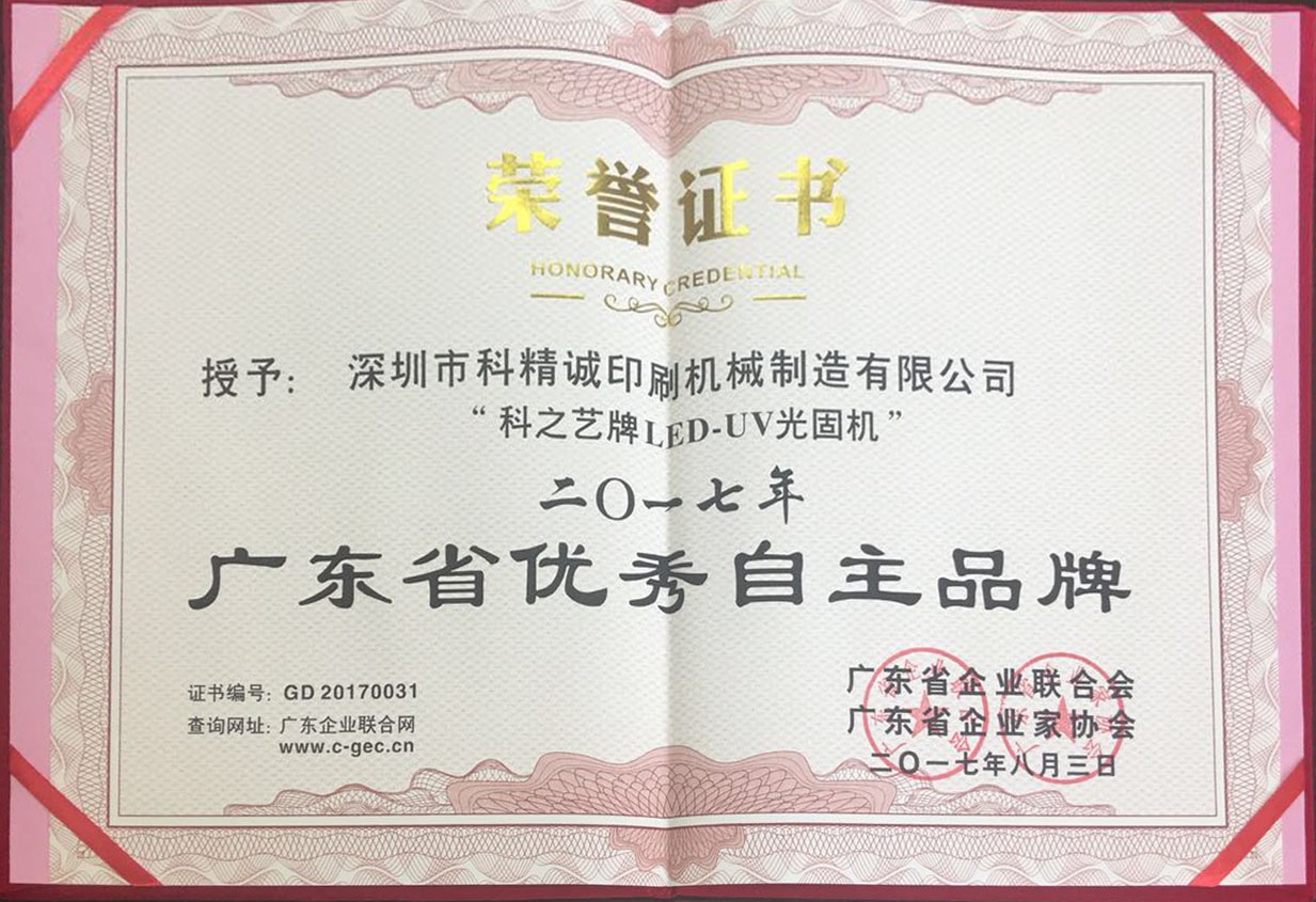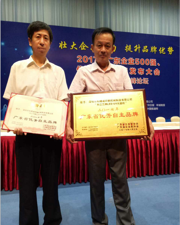 2017年8月3日,由廣東省企業聯合會、廣東省企業家協會舉行的廣東企業500強、優秀自主品牌發布會中,深圳市科精誠印刷機械制造有限公司旗下品牌——科之藝以卓越的表現從數千家品牌中脫穎而出,榮獲“2017年度廣東省優秀自主品牌”稱號。這是對“科之藝”多年來堅持自主創新,努力拼搏,持續打造產品核心競爭力,積極培育優秀自主品牌的高度肯定和認可。